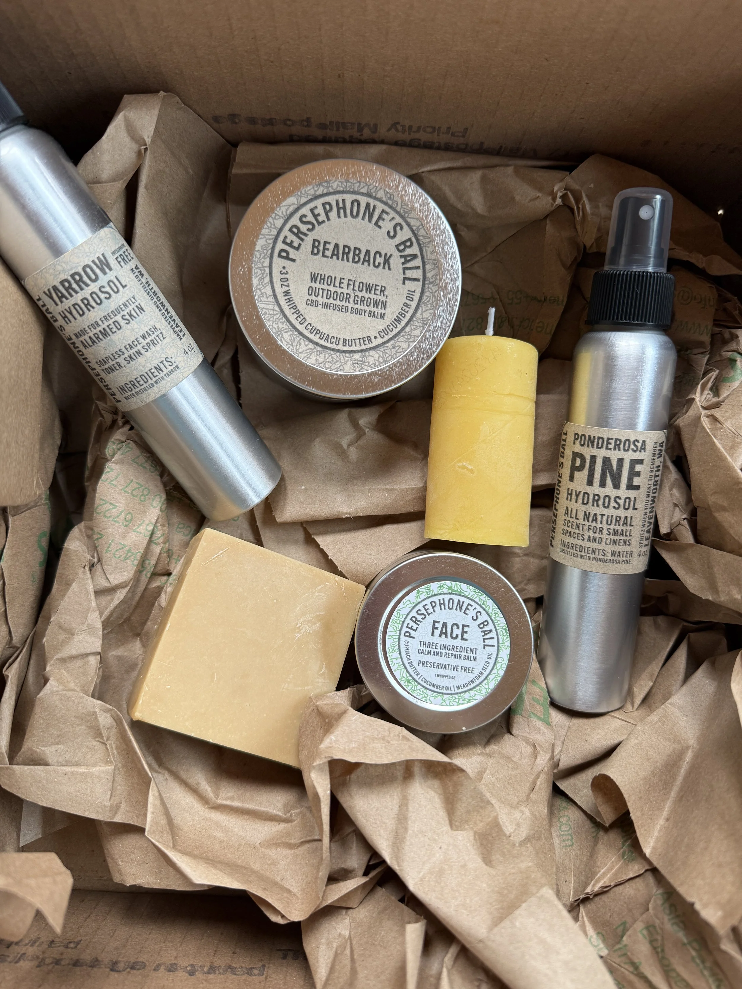 Persephone’s Ball Holiday Box : A beeswax candle in the shape of an evergreen; Ponderosa Pine Hydrosol, a foamy, lathery, quick to rinse, hard (!) Ucuubu Butter Soap made with ponderosa pine hydrosol $30.00